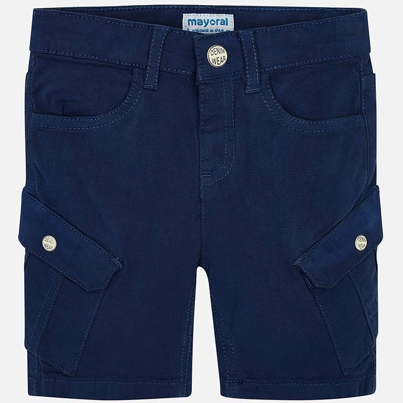 - Bermudy z mocnej tkaniny bawełnianej, regulacja w pasie, zapinane na napy.