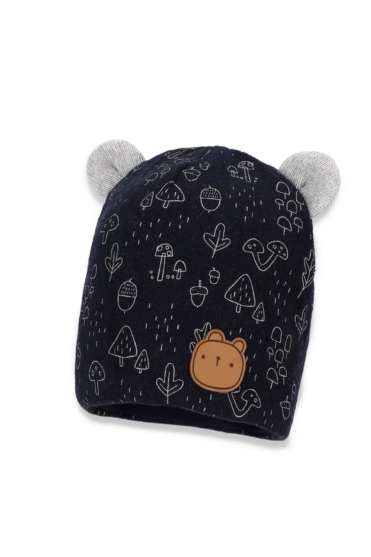 - Granatowa czapeczka z uszkami na bawełnianej podszewce, kontrastowy nadruk oraz głowa misia z eko skóry.
