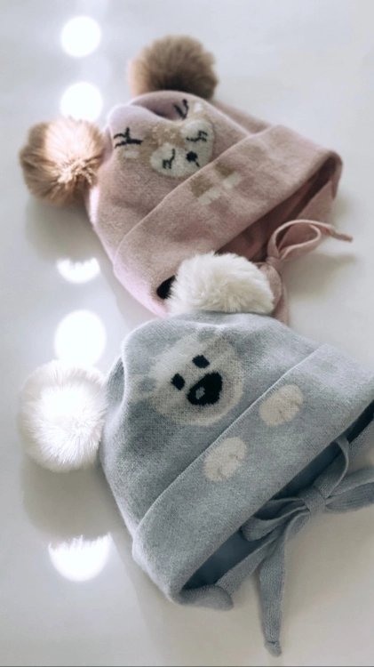 - Ciepła niemowlęca zimowa czapeczka, wiązana, na bawełnianej misiowej podszewce. Ozdobiona dwoma pomponami i głową misia na przodzie.