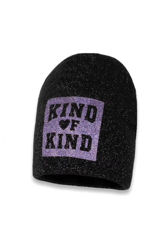- Przejściowa czapka na podszewce, kolor czarny z fioletową metaliczną nitką i błyszczącą aplikacją