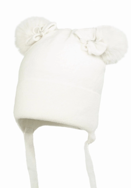 - Ciepła czapka wiązana dla dziewczynki, na bawełnianej podszewce w strukturze polaru. Ozdobiona urokliwymi pomponami i dodatkowo kokardkami przy pomponach z połyskującymi kryształkami.