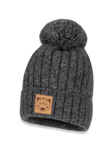 - Zimowa czapka z pomponem, bardzo twarzowa, na bawełnianej podszewce, na wywinięciu emblemat z ekoskóry z głową misia.