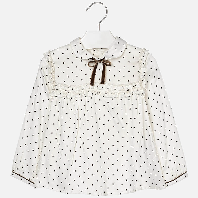 - Koszula z wiskozy z długim rękawem marki Mayoral. Zwiewna, w czekoladowe groszki. Okrągły kołnierzyk i aksamitna kokardka pod kołnierzykiem nadaje niepowtarzalnego charakteru oraz stylu vintage.