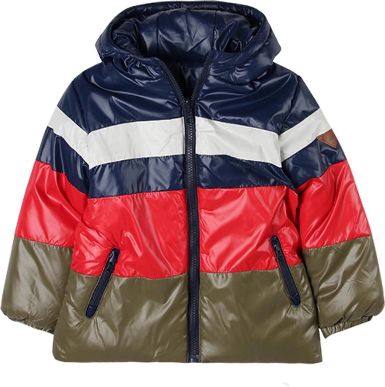 - Dwustronna kurtka dla chłopca zapinana na zamek. Kaptur na stałe, po bokach dwie funkcyjne kieszenie. Jedna strona w kolorowe pasy, druga zaś granatowa.