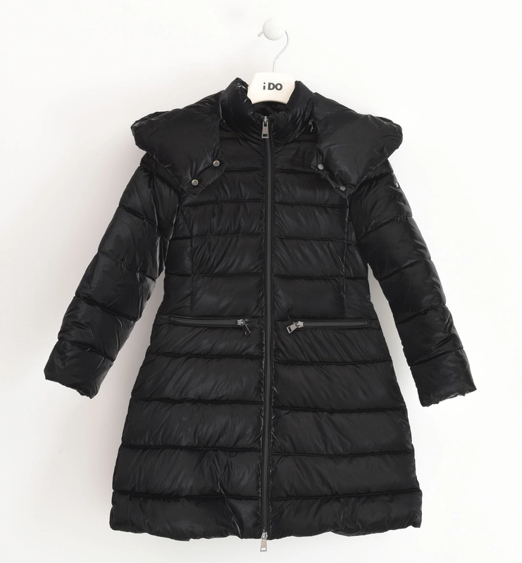 - Dłuższa kurtka dla dziewczynki zapinana na zamek. Odpinany kaptur, posiada 2 funkcyjne kieszenie. Mieniący się kolor czarny z daleka przypomina zamsz.