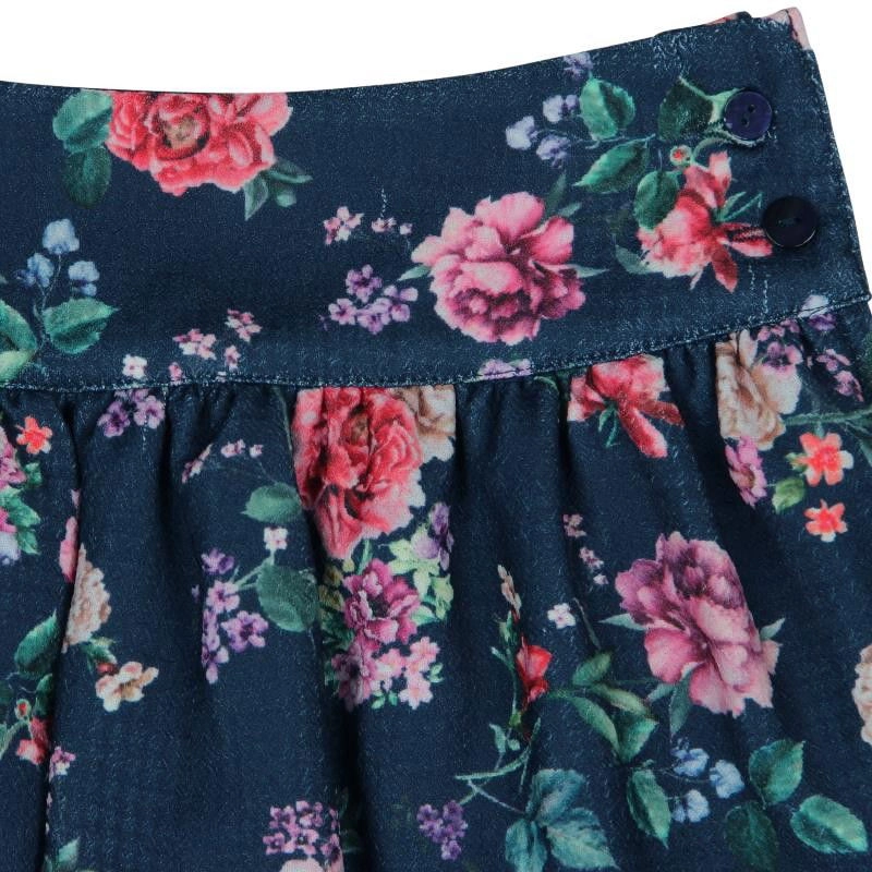 - Elegancka spódnica granatowa w kwiaty. Lekko uniesiona, dzięki tiulowej sztywniejszej haleczce z falbaną. Regulowana w pasie.