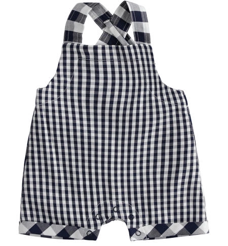 - Spodenki na krzyżujące się szelki w kratkę vichy. Długość szelek regulowana guzikiem. W kroku zapinane na napy.